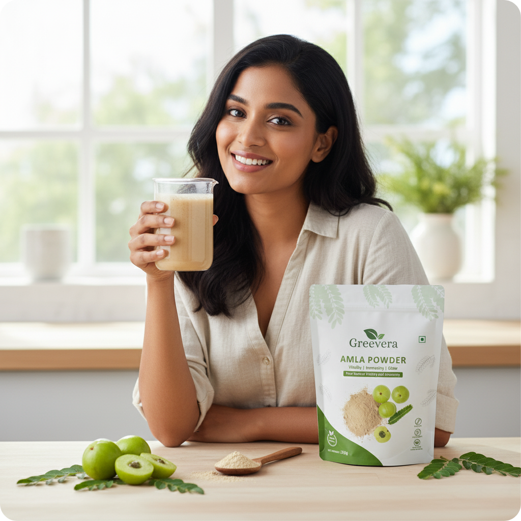Amla powder, made from the nutrient-rich Indian gooseberry, is a natural powerhouse packed with vitamin C and antioxidants. It supports immunity, aids digestion, and promotes healthy hair and glowing skin. Add it to smoothies, teas, or meals for a simple daily boost.
